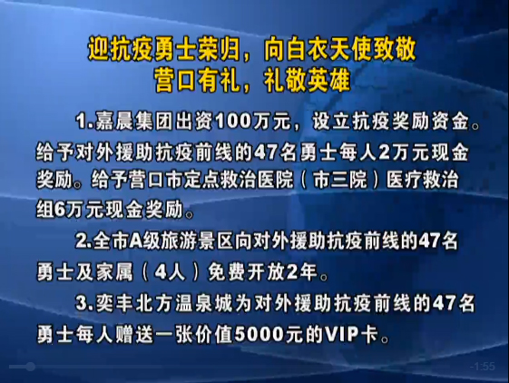 嘉晨集團(tuán)以體現(xiàn)大企業(yè)的責(zé)任與擔(dān)當(dāng),出資100萬元,設(shè)立抗疫獎勵資金。給予對外援助抗疫前線的47名勇士每人2萬元現(xiàn)金獎勵;給予營口市定點(diǎn)救治醫(yī)院(市三院)醫(yī)療救治組6萬元現(xiàn)金獎勵。以此表達(dá)對抗疫英雄的崇高敬意和無限愛戴。